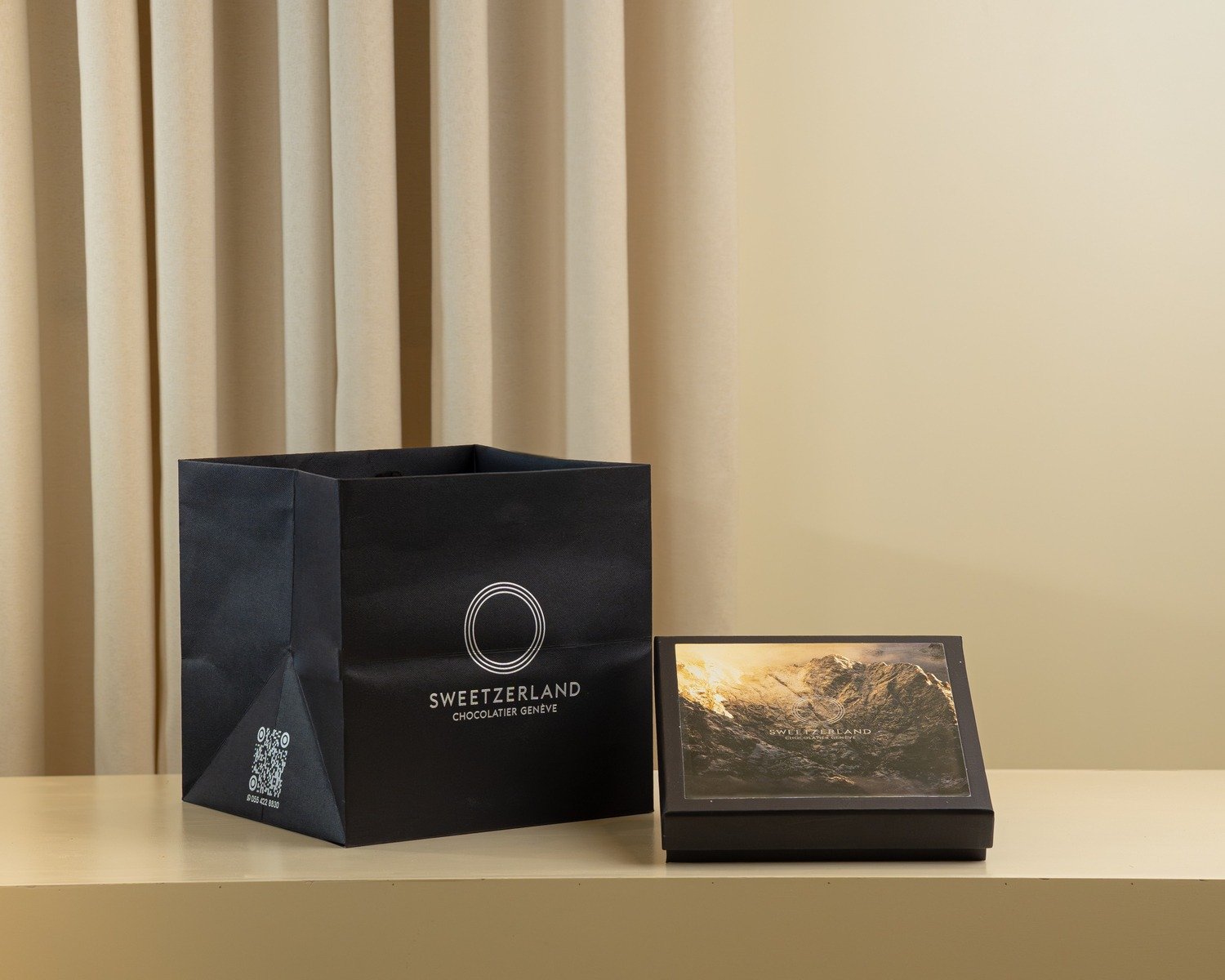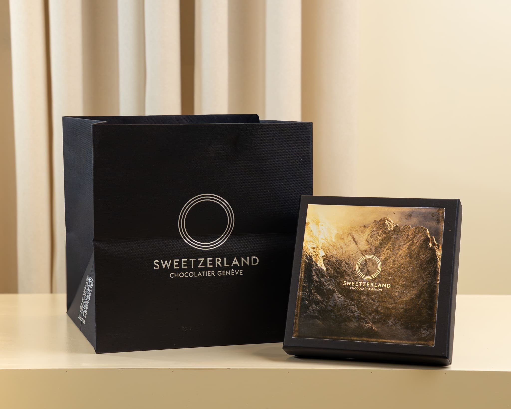 صندوق مميز من مجموعة مختارة بدقة من الشوكلاتة الفاخرة الاكثر شهرة في سويسرا يحتوي صندوق الشوكلاتة على انواع مختلفة من الجاناش الطيب