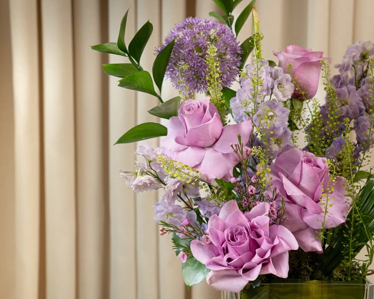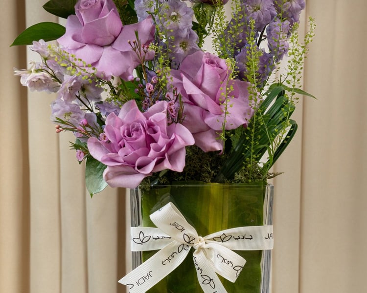 توليفة ساحرة تجمع بين الدليفنيوم الموف بلونه الملكي وورد الجوري الكلاسيكي الذي يفيض عشقا ورقيا يكتمل المشهد بلمسات من السلقراص الناعم مع لمسه مميزة من الثوم النيلي الذي يضيف بعدا عصريا
